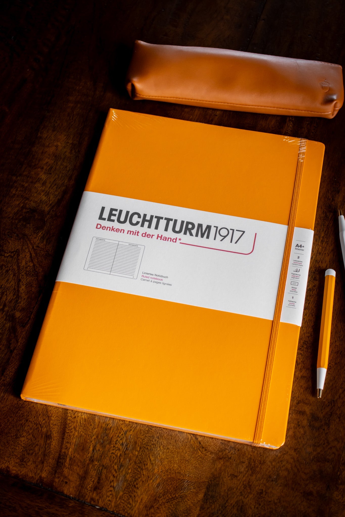 The slim alternative: our Master Slim. The Master Slim is also just larger than an A4 and can hold loose sheets between the pages and in the expandable pocket without the edges protruding. Furthermore, the Master Slim notebook features 100 g/m² paper. However, it only has 123 pages and is therefore 33% lighter than the Large journal. This means that the Master Slim is the ideal companion for all notebook-lovers who want to write in ink and always have their notebook to hand.