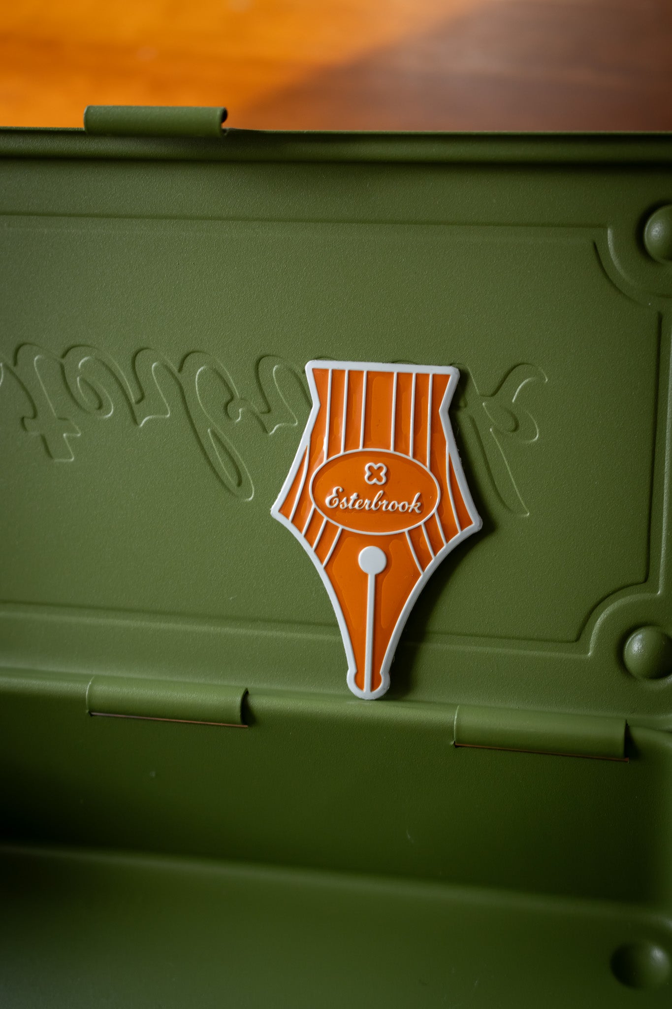 Toyo Steel's T-190 box, featuring a debossed Esterbrook logo and the vintage R. Esterbrook emblem in a vibrant Turtle Green color, offers a blend of robust utility and classic style. Each box includes an orange sticker, allowing for personal customization.