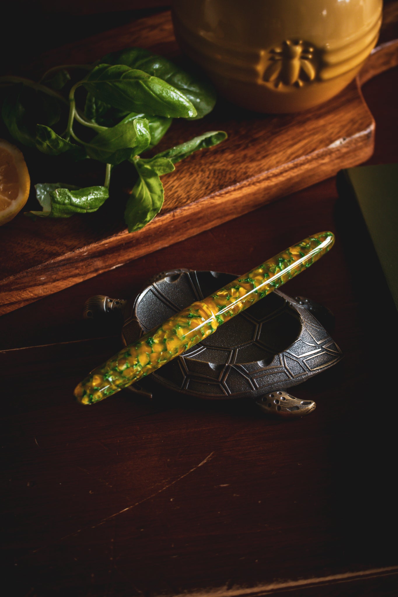 - Blended and turned acrylic made with a “Rainforest” mix of colors and a high polished finish