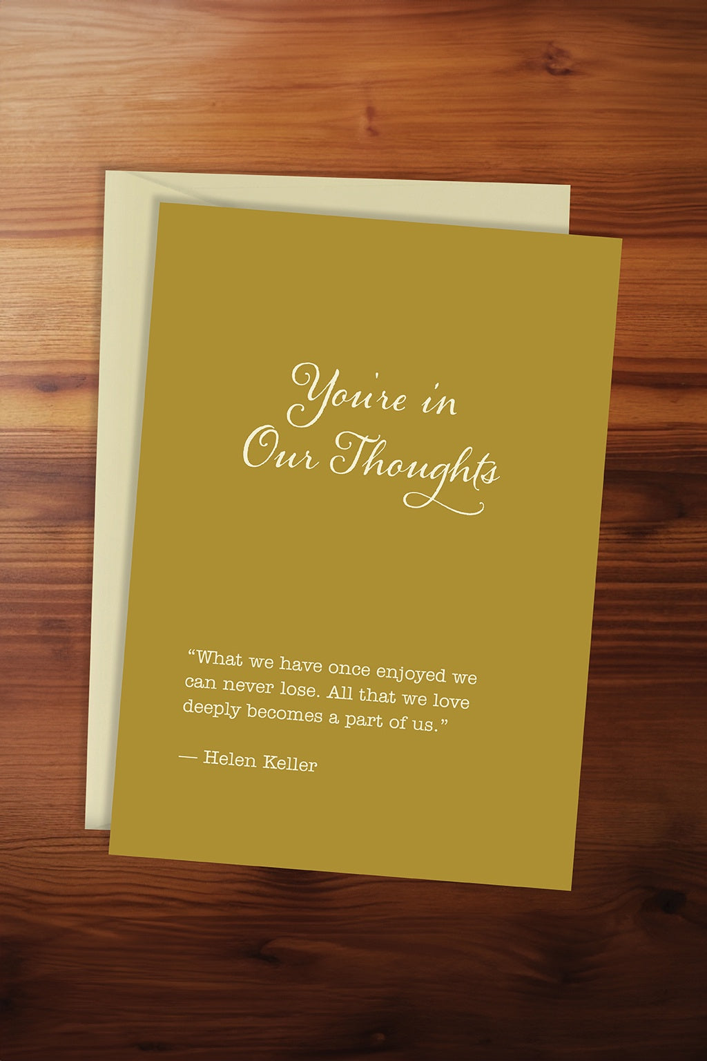Greeting card reads: You're in Our Thoughts "What we have once enjoyed we can never lose. All that we love deeply becomes a part of us.” - Helen Keller